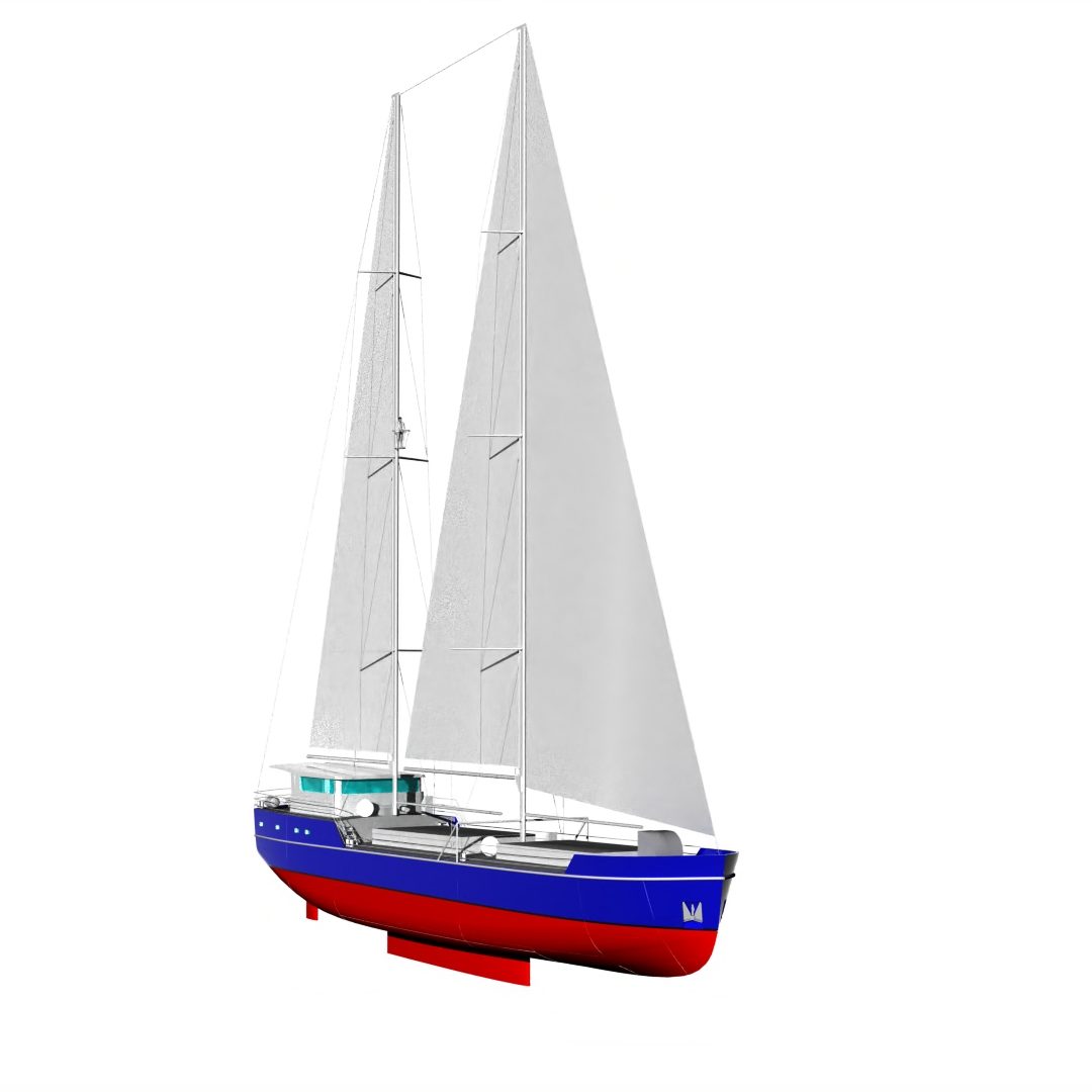 Designed, in collaboration with Brad Ives and Evy Ben Resheph from Clean Voyages, as the workhorse, best suited on routes with a lot to haul. The Design is minimized and maximized for sailing performance. A tall Rig and a hydrodynamic shaped rudder and Keel provide for good performance at all points of sail. A narrow beam for reduced resistance and improved sea motions. Minimized accommodations and deckhouse provide better aerodynamic performance and reduces weather helm.